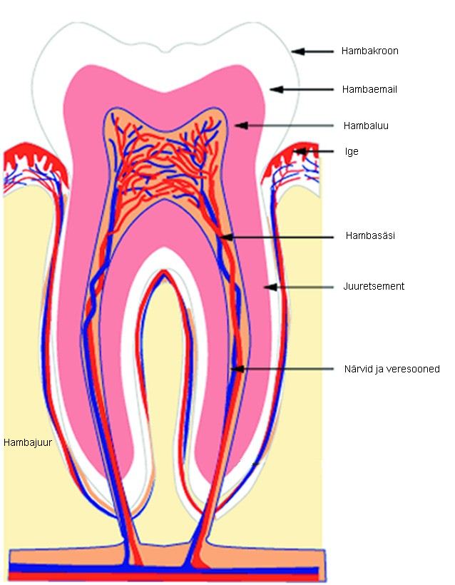 Hambal eristatakse igemepealset osa, mida nimetatakse hambakrooniks, ning hambasombus ehk alveoolis paiknevat osa, mida nimetatakse hambajuureks. Vahepealne igemega kaetud osa on hambakael. Hambajuurt katab hambajuureümbris ehk parodont (hammast hambasompu kinnitavate sidemete süsteem). Peamine hambakude on hambaluu ehk dentiin. Krooniosas katab hambaluud hambaemail ehk hambavaap, mis on organismi tugevaim kude. Juurepiirkonnas hambaluud katvat kude nimetatakse juuretsemendiks. Hamba keskel paikneb hambasäsi ehk -pulp, mis sisaldab veresooni, närvilõpmeid ja sidekude. Veresooned ja närvilõpmed sisenevad hambasse juuretipu ava kaudu. Veresooned tagavad hambakudede varustamise toitainete ja hapnikuga, närvilõpmed on valuretseptorid.