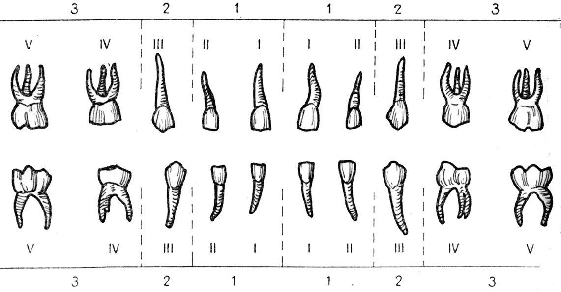 Piimahambad: 1 – lõikehambad (I – keskmine, II – külgmine), 2 – silmahambad (III), 3 – purihambad (IV – esimene, V – teine).