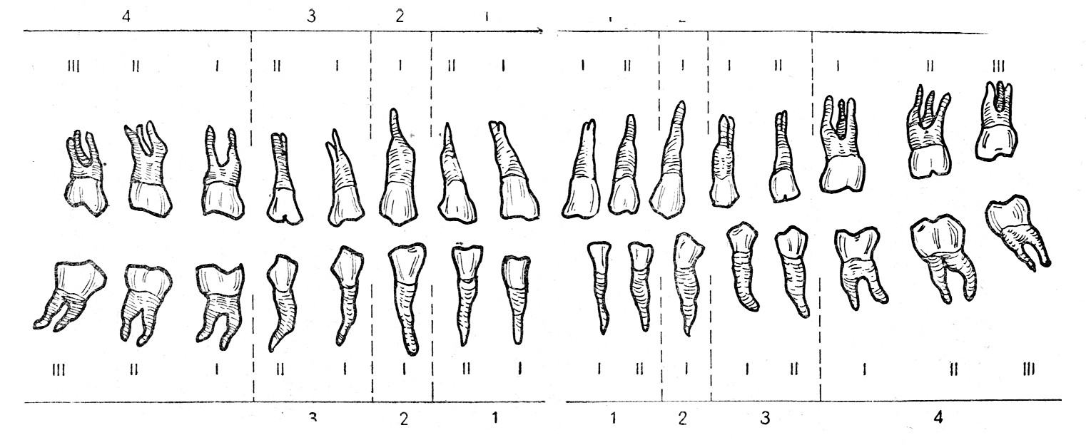 Jäävhambad: 1 – lõikehambad (I – keskmine, II – külgmine), 2 – silmahambad, 3 – eespurihambad (I – esimene, II – teine), 4 – purihambad (I – esimene, II – teine, III – kolmas purihammas ehk tarkusehammas).